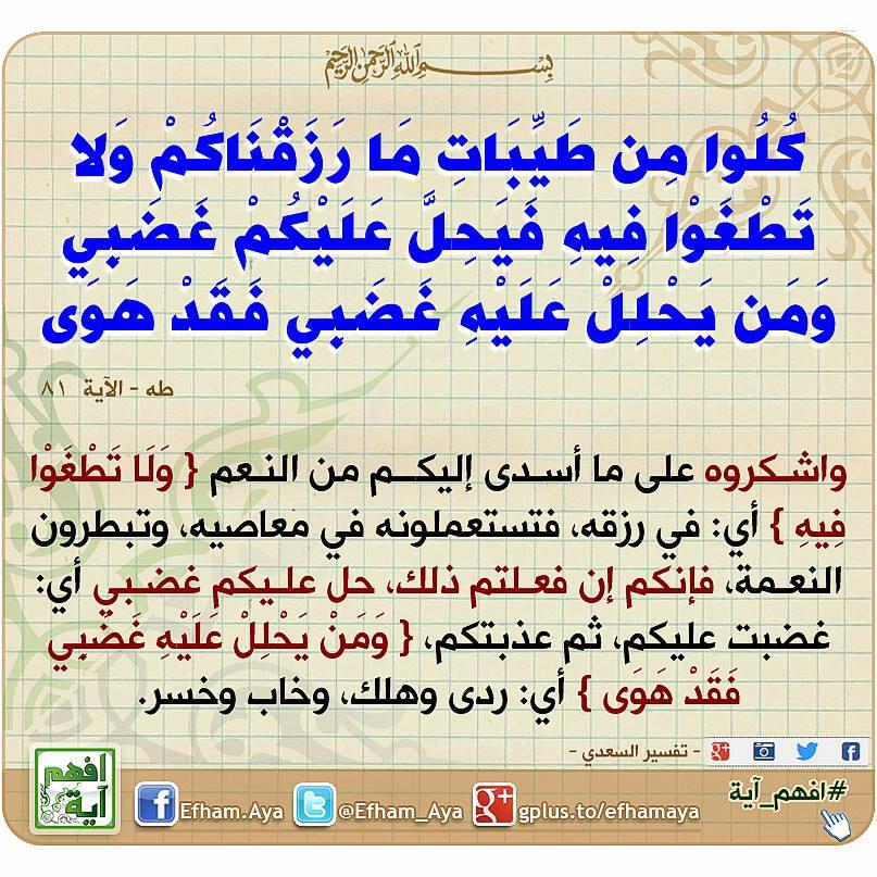 افهم آية Pa Twitter كلوا من طي بات ما رزقناكم ولا تطغوا فيه فيحل عليكم غضبي ومن يحلل عل يه غضبي فقد هوى افهم آية قرآن Http T Co Xu36nicl8w