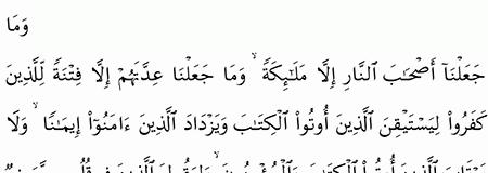 وما جعلنا أصحاب النار إلا ملائكة وما جعلنا عدتهم إلا فتنة للذين كفروا ليستيقن الذين أوتوا الكتاب ويزداد الذين ءامنوا إيمانا ولا يرتاب الذين أوتوا الكتاب والمؤمنون وليقول الذين في قلوبهم مرض